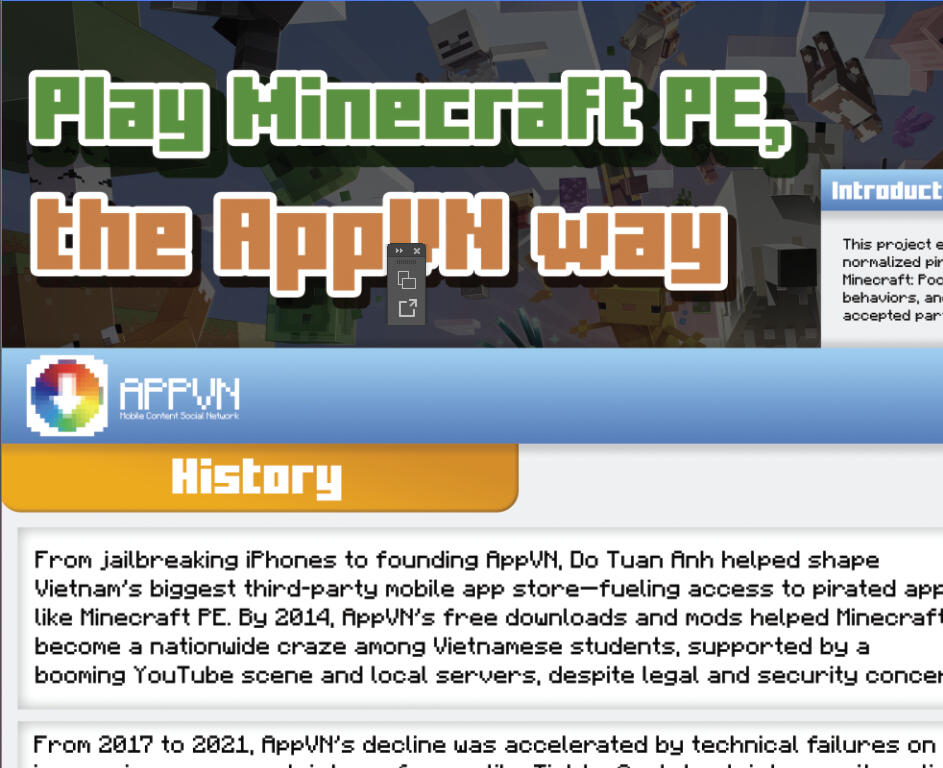 - [Researched how pirated platforms shape player behavior] by examining AppVN’s role in normalizing software piracy in Vietnam- [Used Minecraft as a case study] to analyze how accessibility and distribution influence adoption and cultural legitimacy- [Applied mixed research methods], combining user surveys with historical and secondary data analysis- [Contributed to insights on user attitudes] toward copyright, access, and perceived ownership of digital products- [Produced documentation and visual research materials] supporting analysis and presentation outcomes